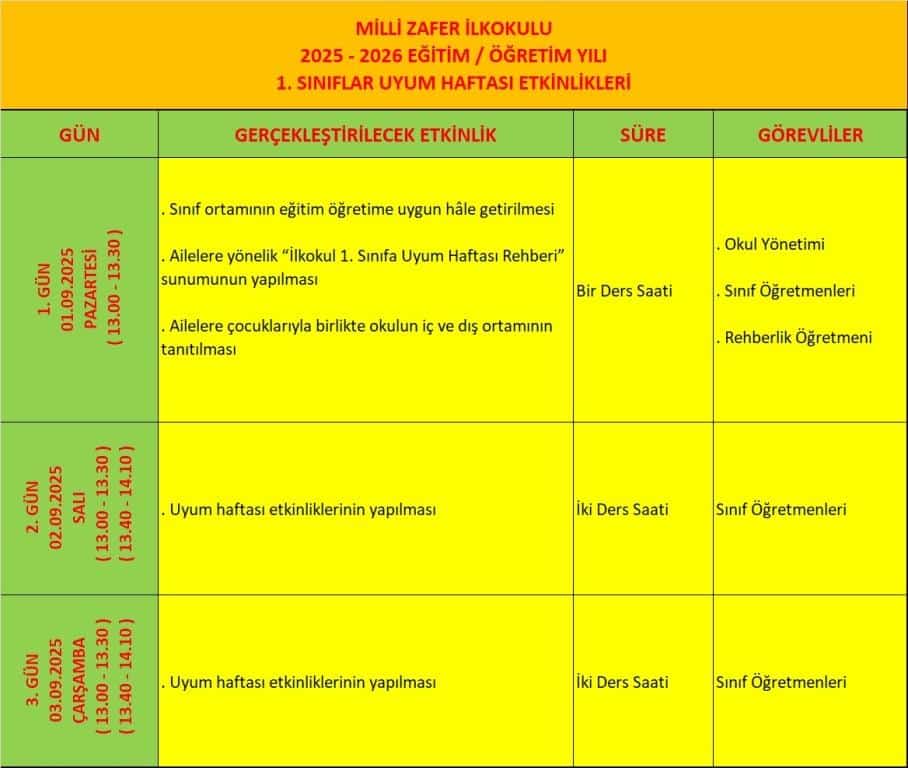 Okulumuz Ana Sınıfları ve 1. Sınıflara ait 1 - 5 Eylül tarihleri arasında yapılacak olan "Uyum Haftası Programı" etkinliklerine ait çizelge aşağıda yer almaktadır. 2025 - 2026 Eğitim / Öğretim yılının tüm öğretmen - öğrenci ve velilerimize sağlık ve mutluluk getirmesi dileklerimizle...